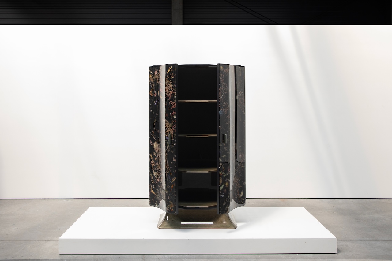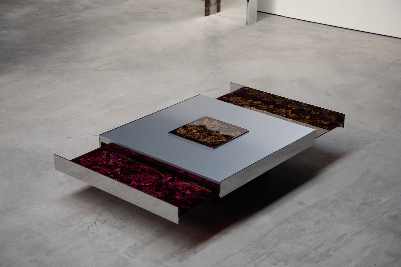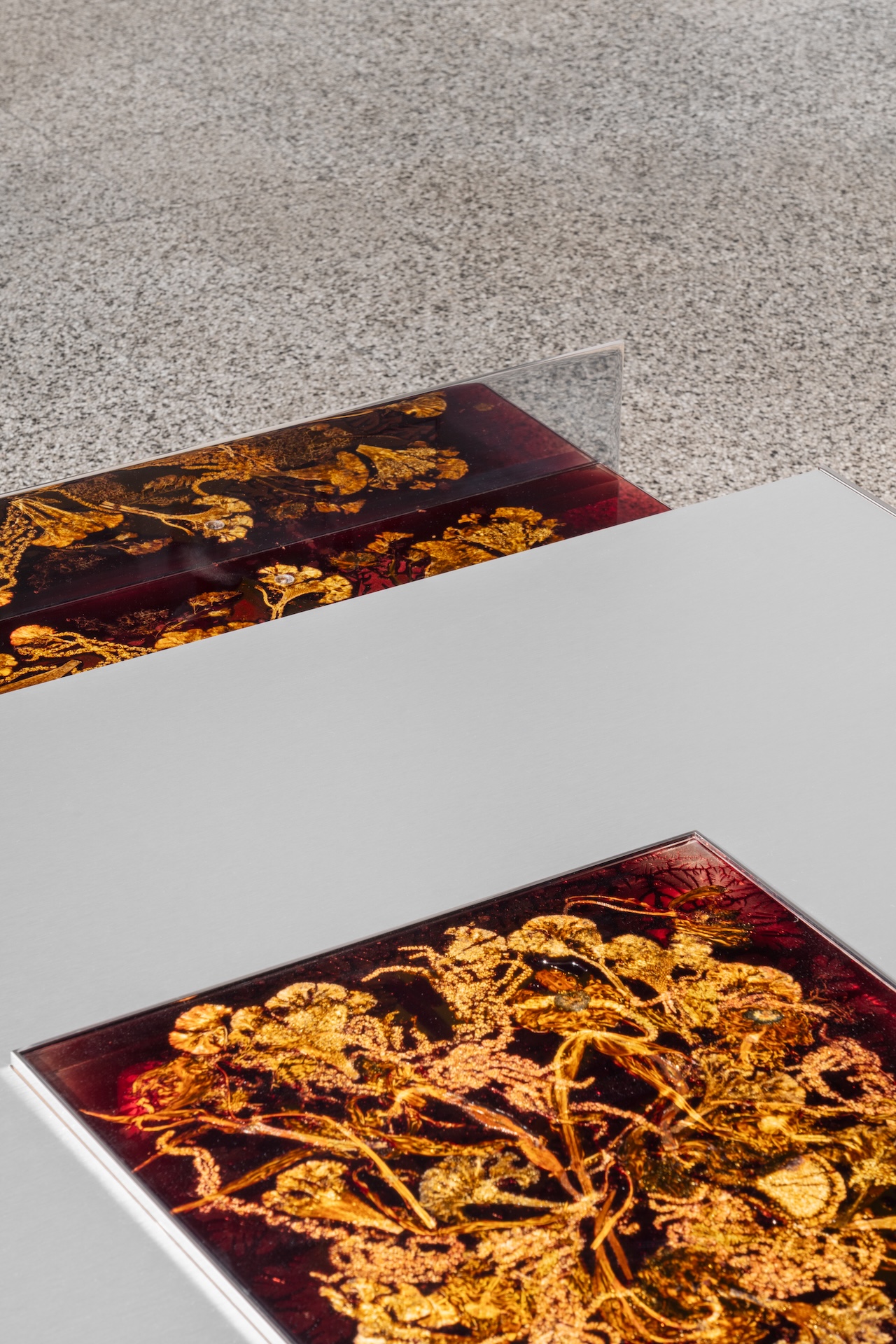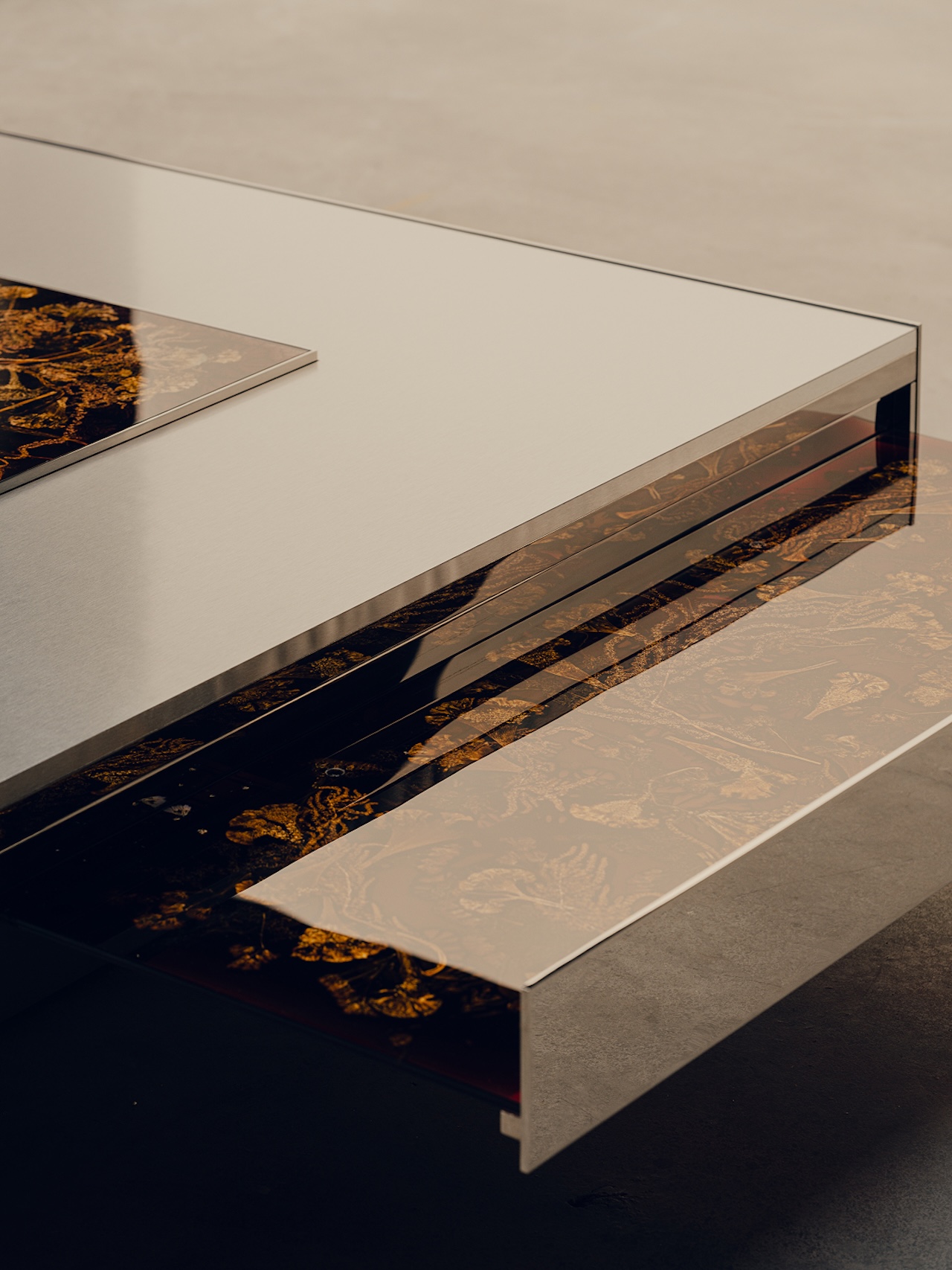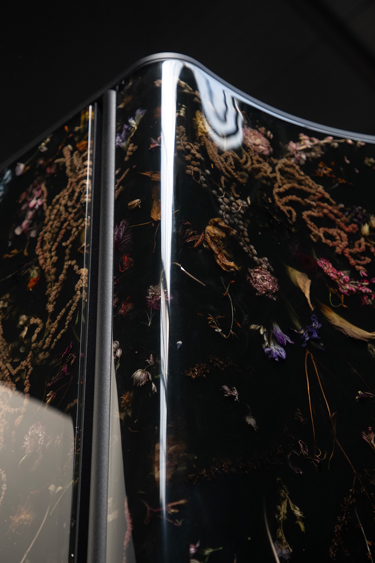 The exhibition debuts several new statement pieces, including 2.5-meter herbarium panels that laminate selected flowers and plants between sheets of glass. Alongside a new shelving system, coffee table, and mirror that extend Rusak’s flagship Flora series, the works mark a stylistic and technological shift for the studio. Custom 3D-printed biodegradable sconces complete the staging. Visitors were encouraged to sit, recline, and linger.