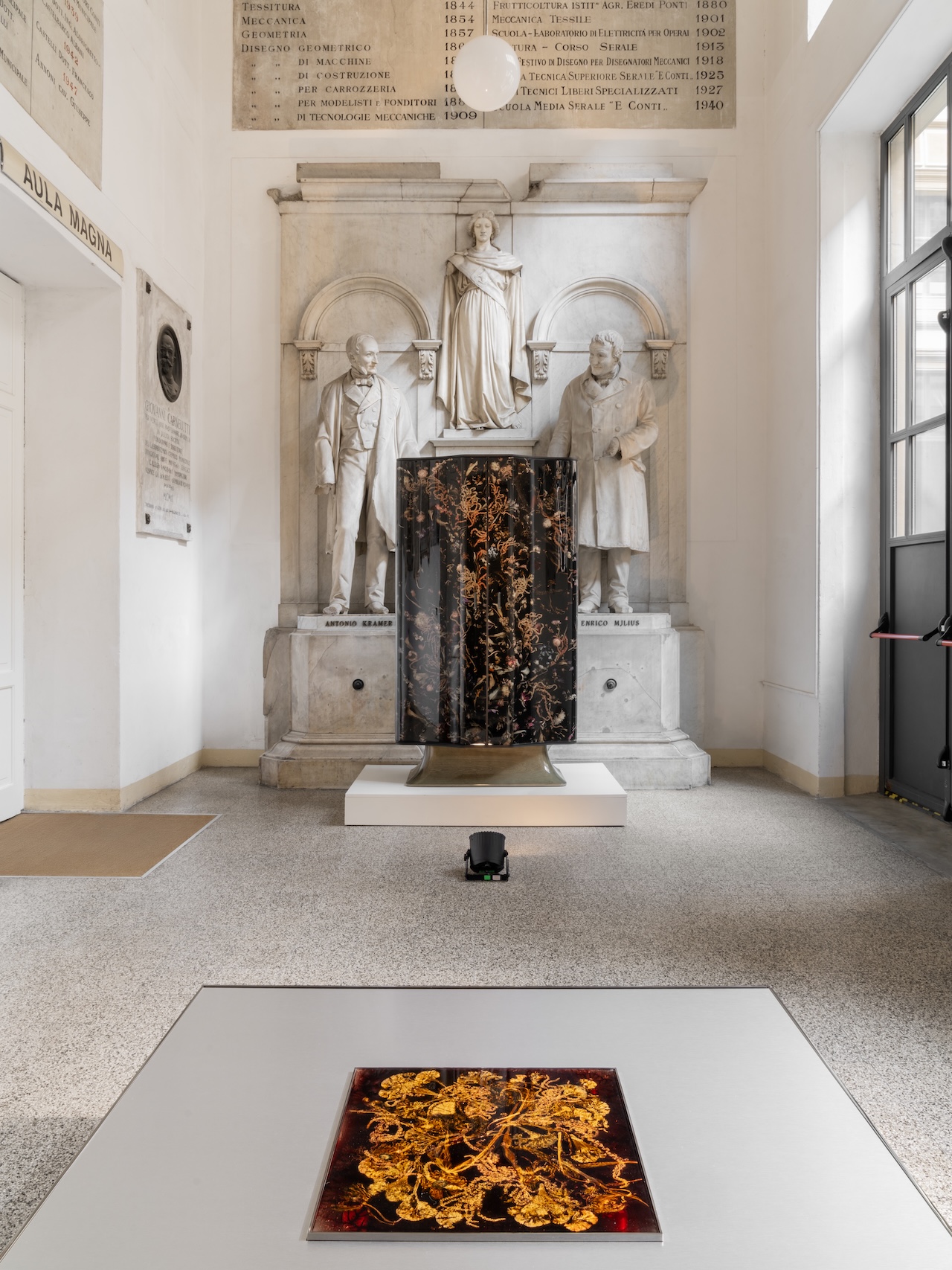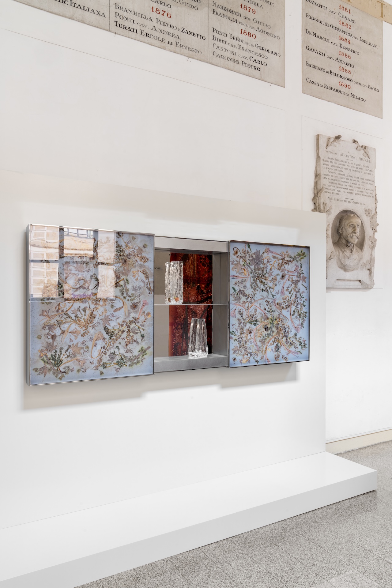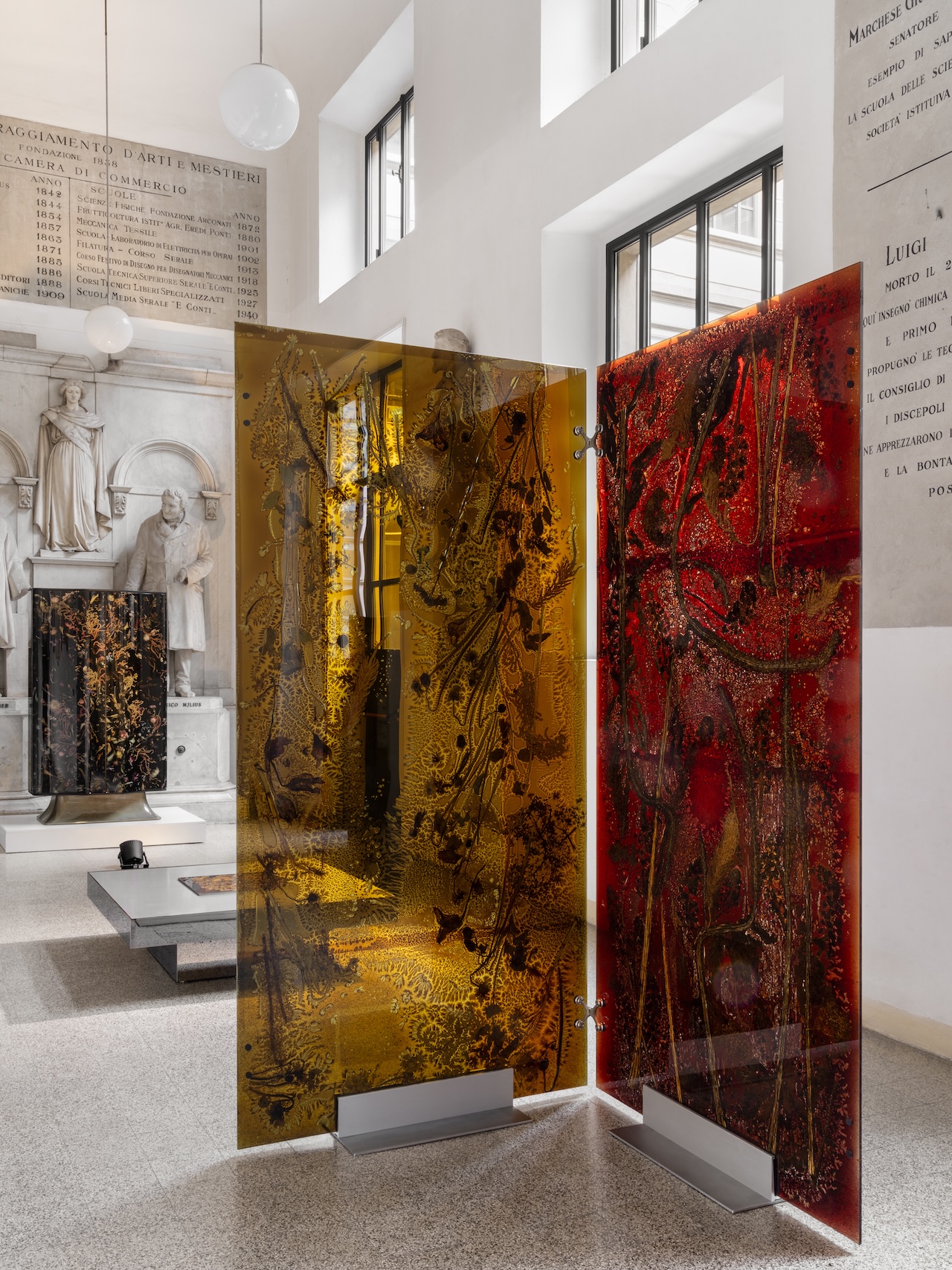 SIAM was established to encourage arts and crafts among Milanese workers, and it remains a public cultural institution serving students, designers, and a culturally engaged audience rather than collectors and buyers. Rusak’s decision to mount his new body of work here, rather than in a Brera gallery or a Tortona warehouse, reframes the exhibition as a pedagogical platform. The Latin title, which translates roughly to ‘flower market,’ doubles as an invitation to gather and exchange ideas.