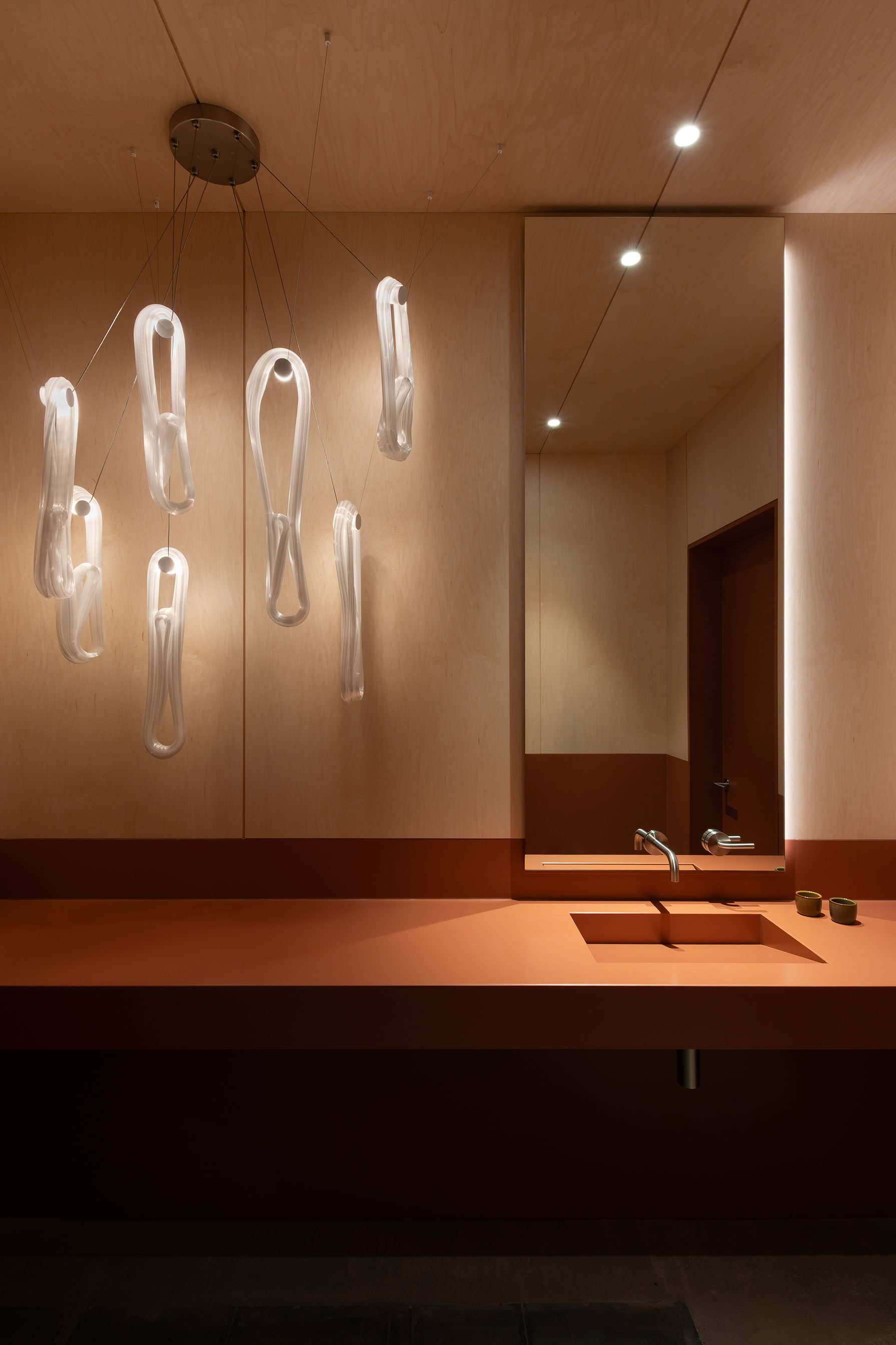 Strategically placed pops of color produce visual energy without overwhelming the rest of the interior elements. Orange chairs and dividers animate the main zones of the office, while a rich rust tone envelops the largest boardroom. A linear fixture in a soft blue seems to float above the desk area, with seats in a similar tone set in the rooms below.