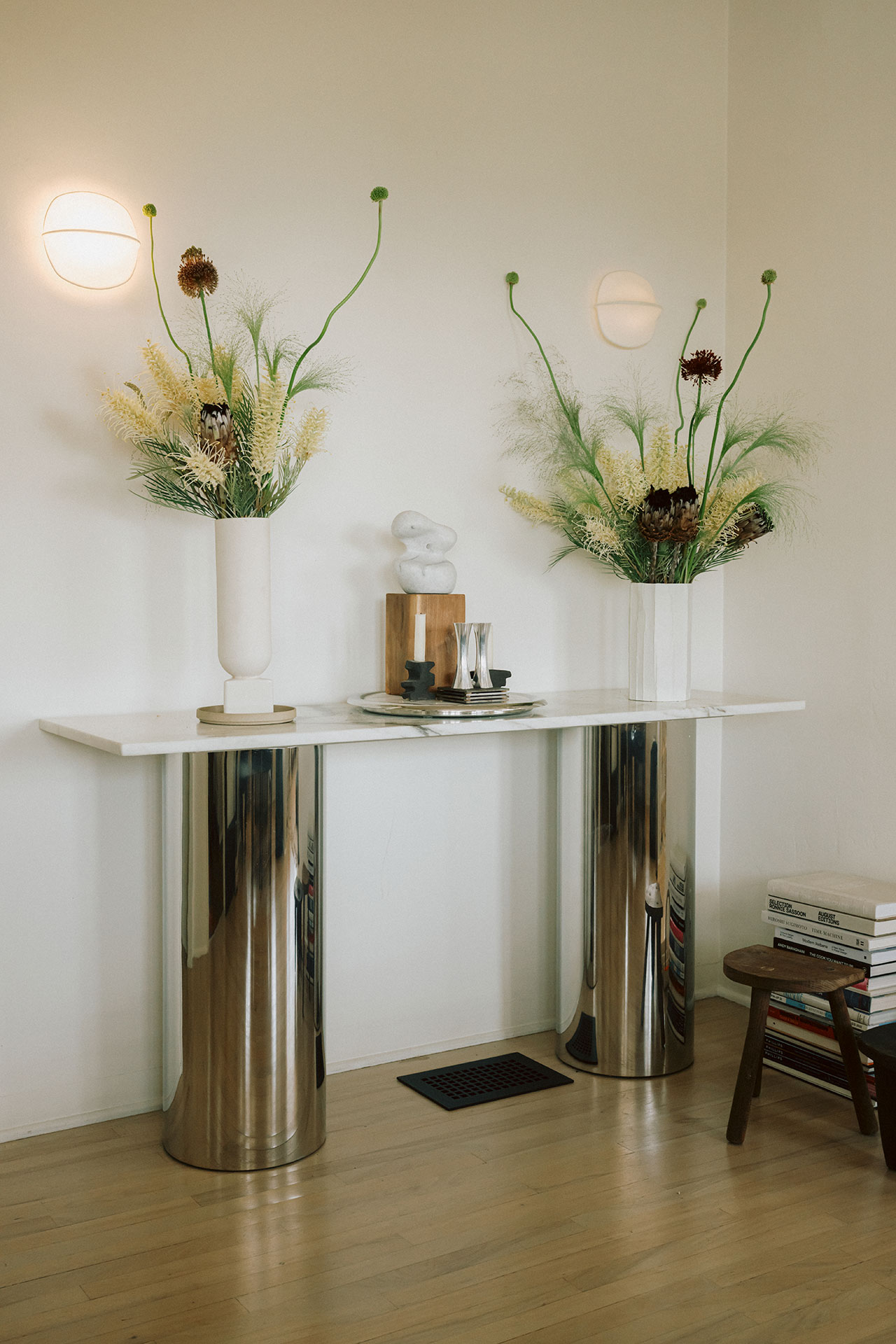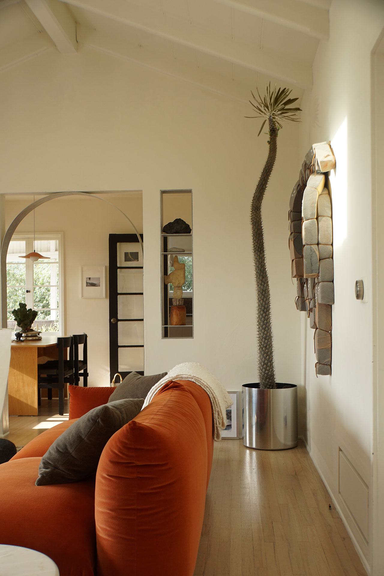 A reupholstered vintage Marenco sofa in burnt orange velvet anchors the living room, its saturated tone pushing firmly against the quietude of the envelope. Chrome surfaces—fixtures, planters, and furniture—thread through the home, catching light and connecting disparate rooms with a reflective continuity. Black leather, plywood, matte black hardware––each material registers as a distinct voice rather than part of a unified palette.