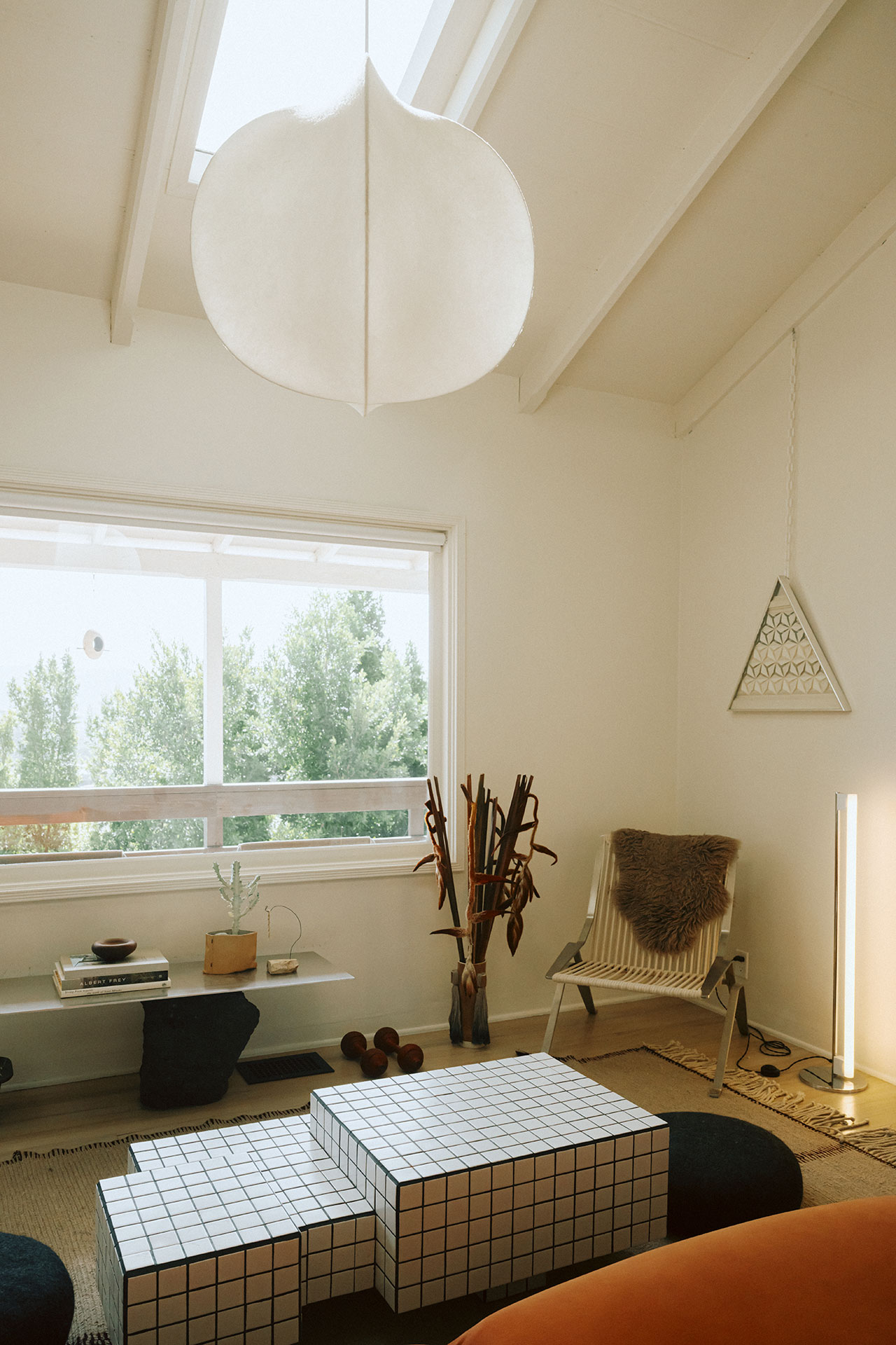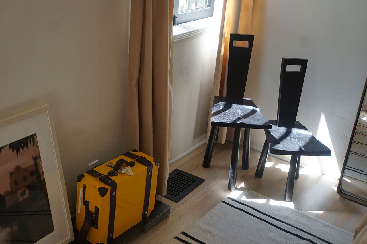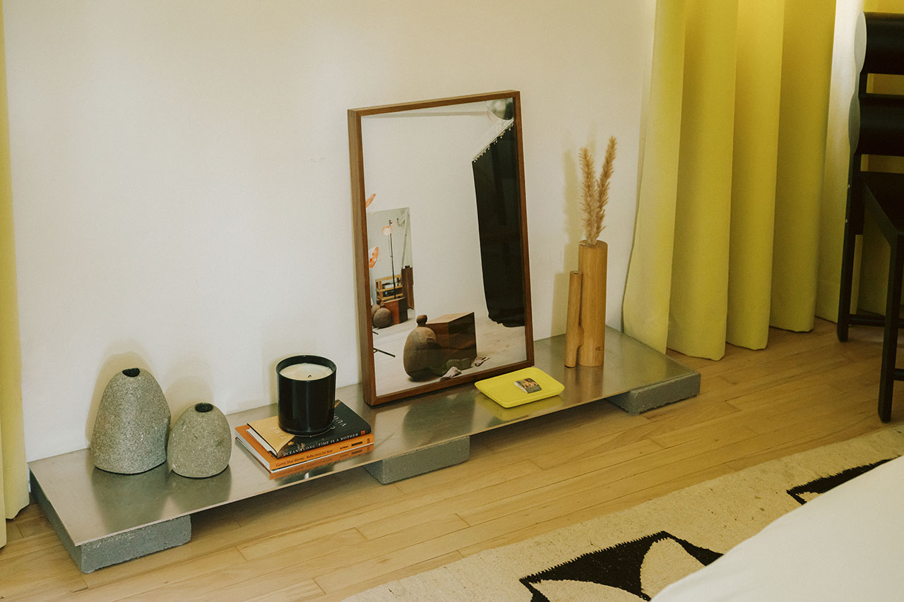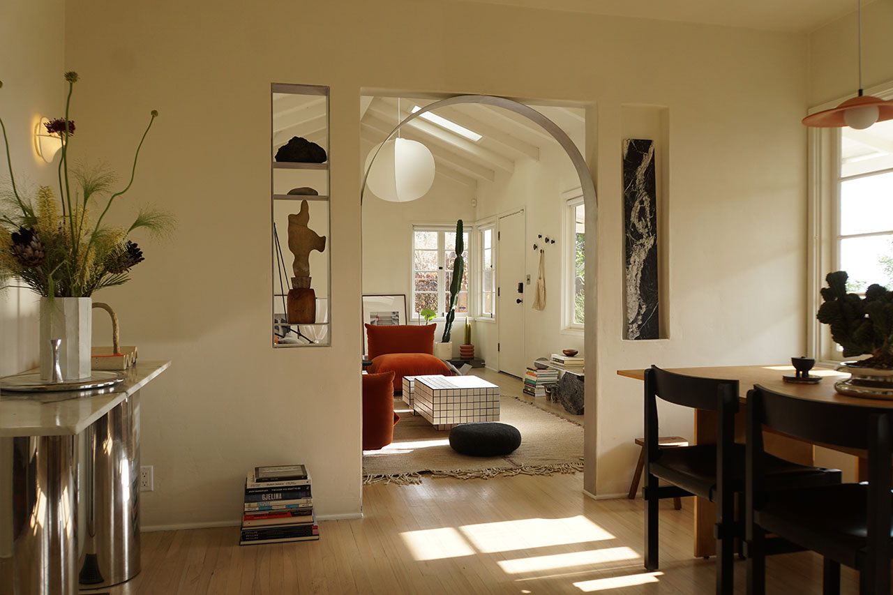 The renovation, completed over the course of a year, was less about transformation than calibration. The challenge, Yuri explains, was to modernize the home while preserving its modest 1940s charm. The original structure remains largely intact: a single-level, two-bedroom layout anchored by a front porch that stretches the length of the house. But inside, the project unfolds as a layered interior landscape, where objects carry the narrative weight more so than architecture.