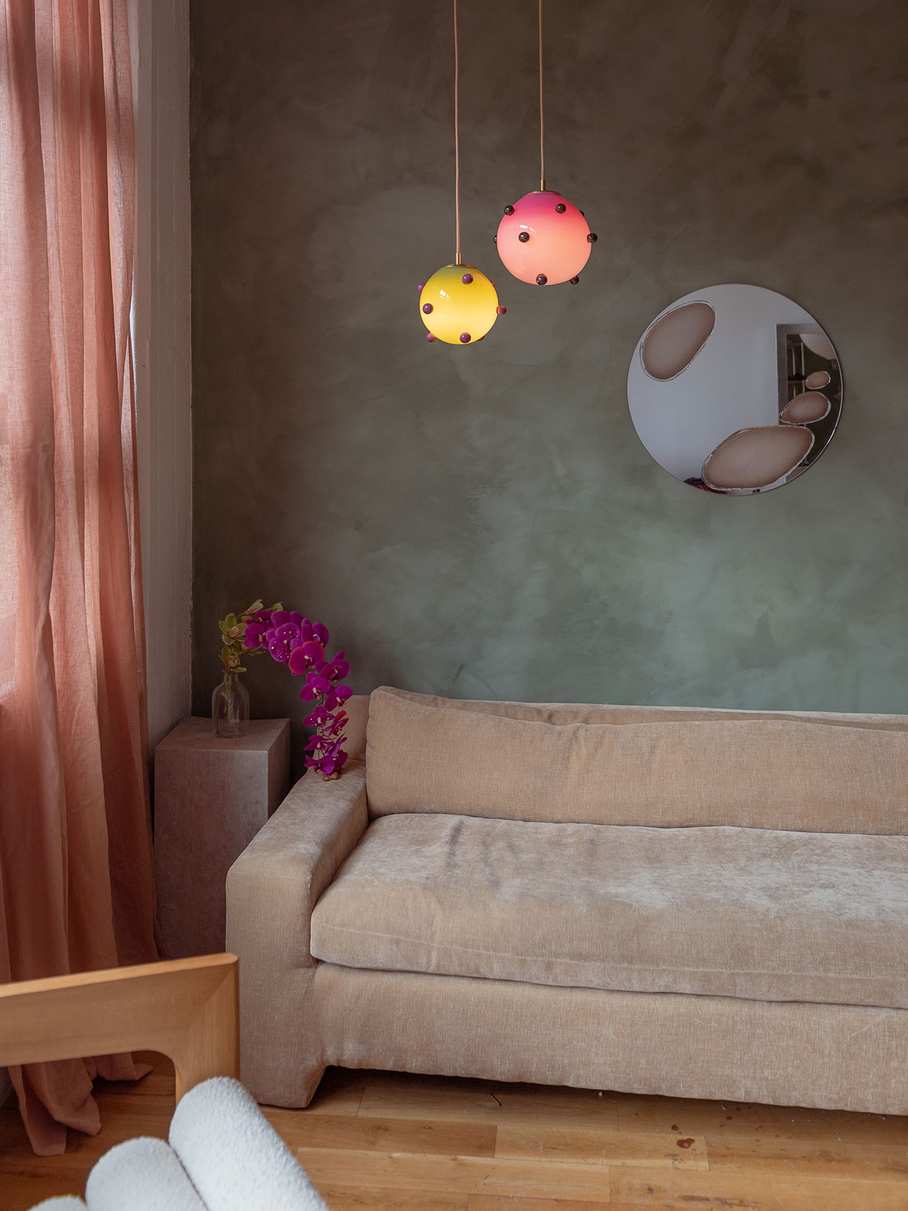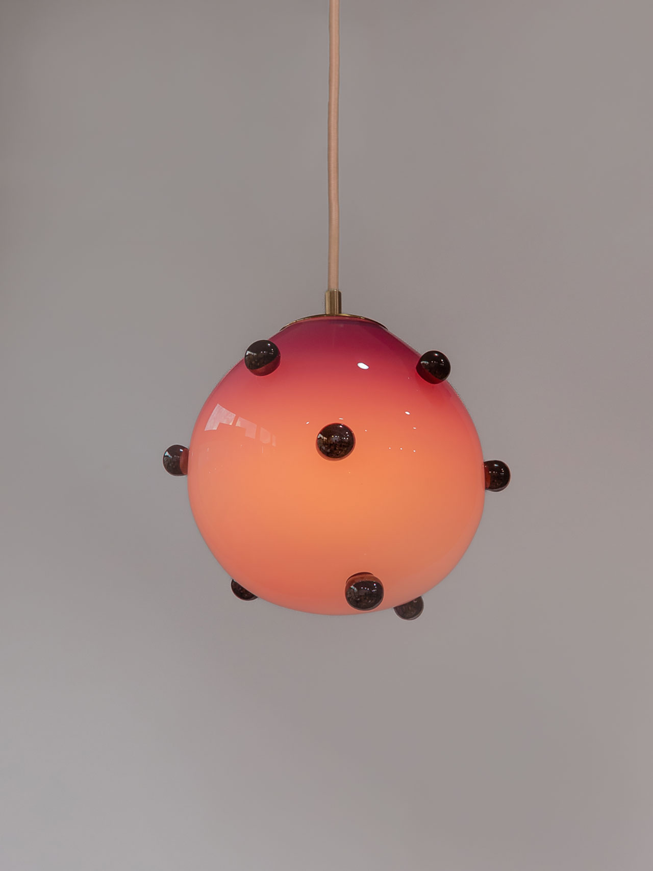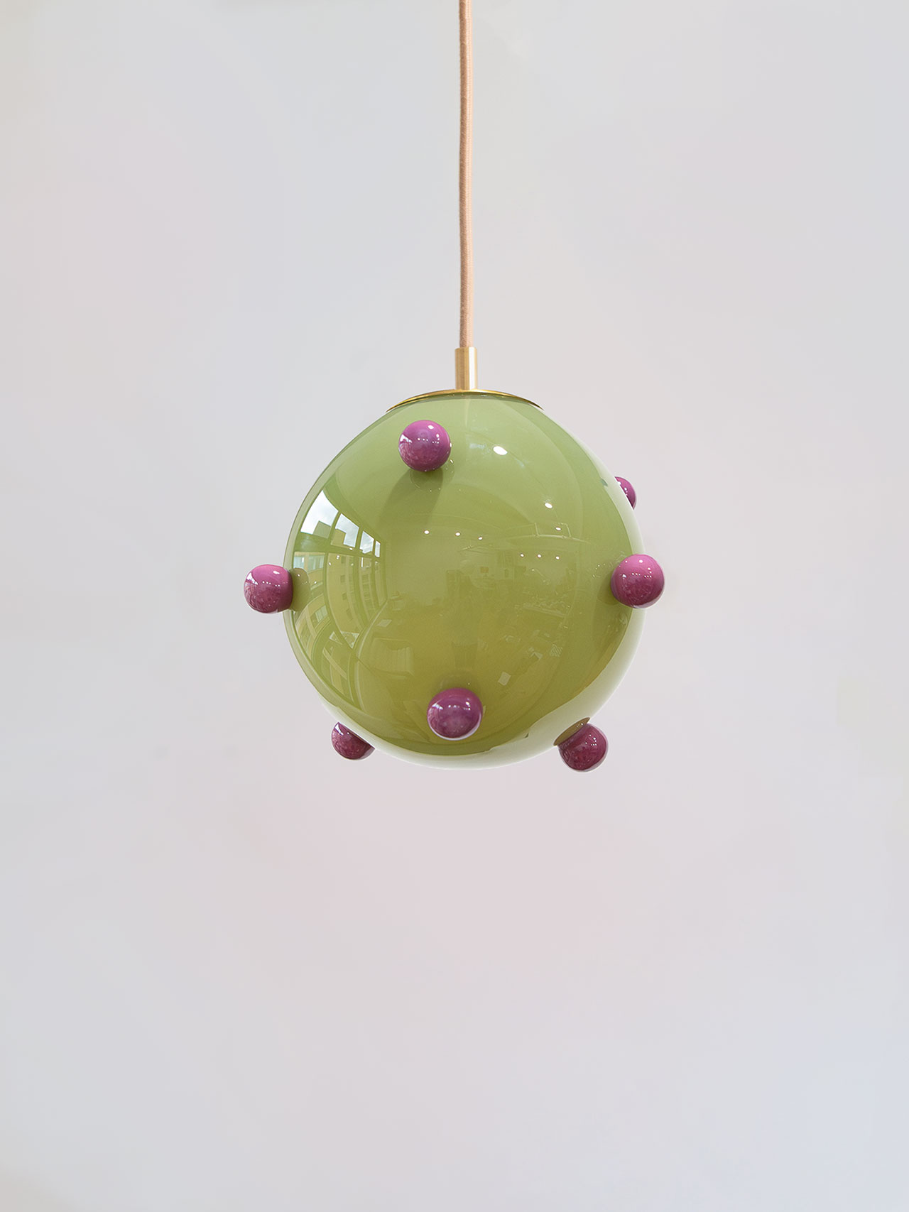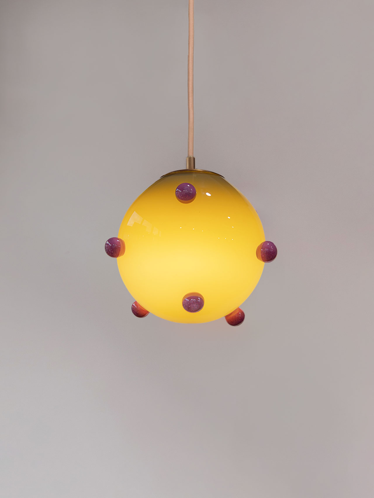 The Olive Polka Pendant, olive with purple dots, are fused and inset just slightly into the main body of the lamp, resting gently on the surface, virtually weightless. The Berry Polka Pendant, purple with olive dots, is not it’s pair’s opposite, but a sister, or maybe a cousin. A warm glow exudes from the orbs, held in stately brass hardware, suspended in space. Powerful when hung in tandem, they bring balance either right next to each other, or separately, adding to the use cases where we could imagine these pieces.