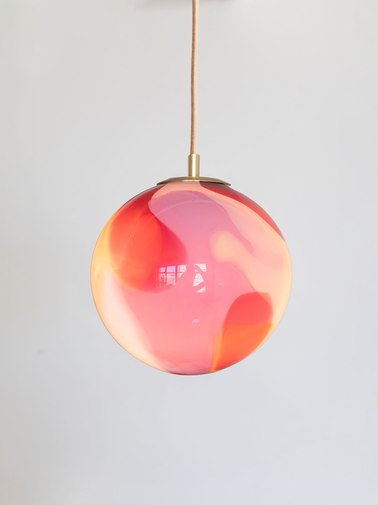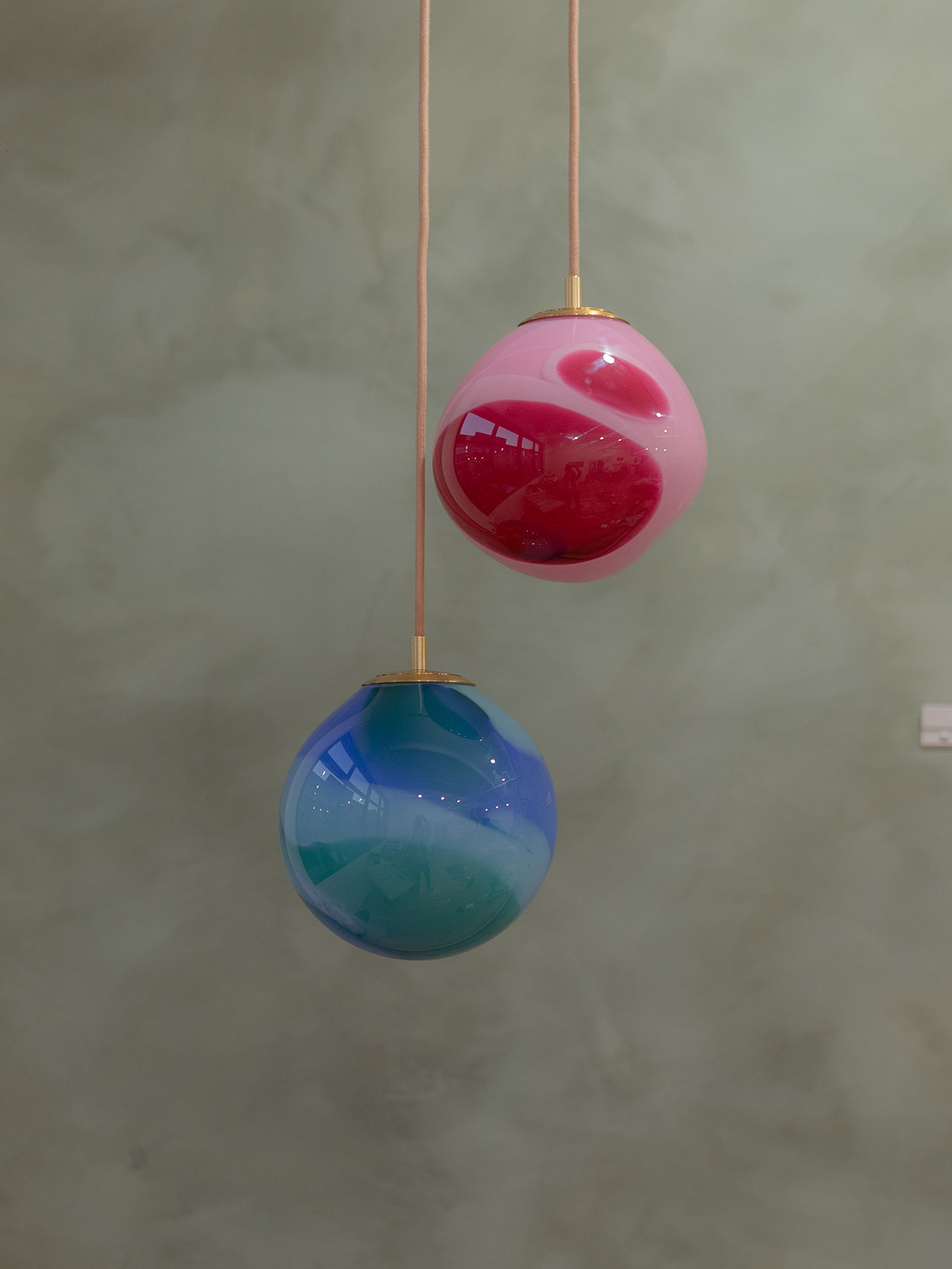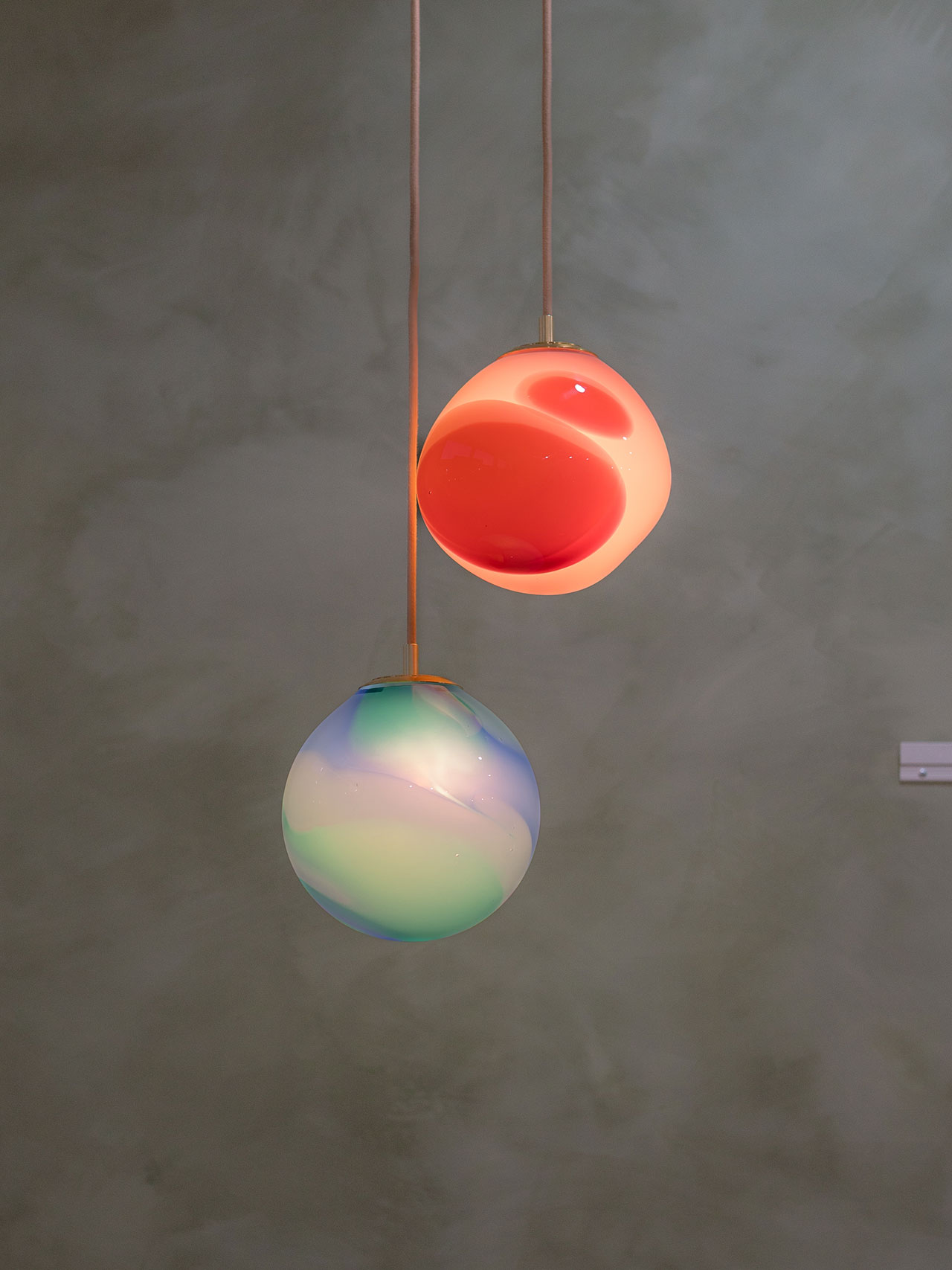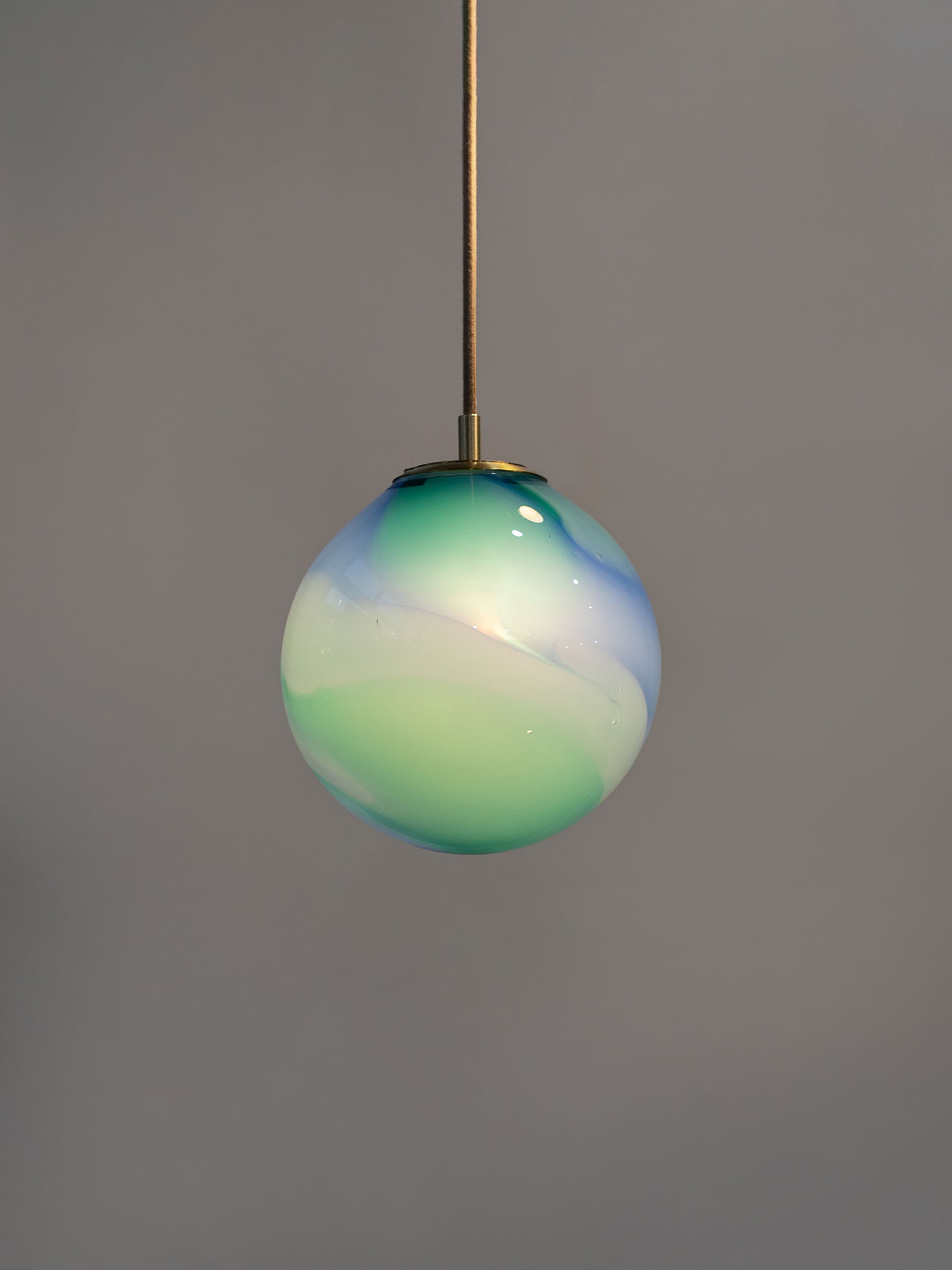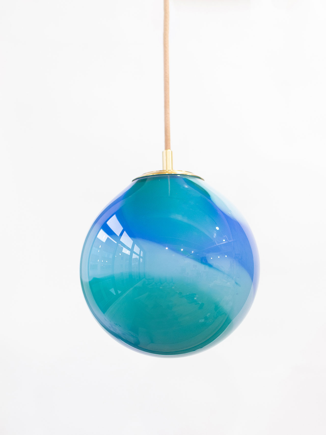 These brilliant blues and aquas create a beautiful balance between warm and cool, a tactile yet ethereal quality tied to the work. As each piece is handmade, there will be welcome change within the globes, each a product of the unique expertise that brings this lighting to life.