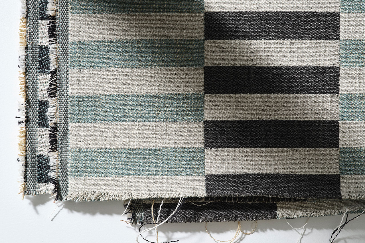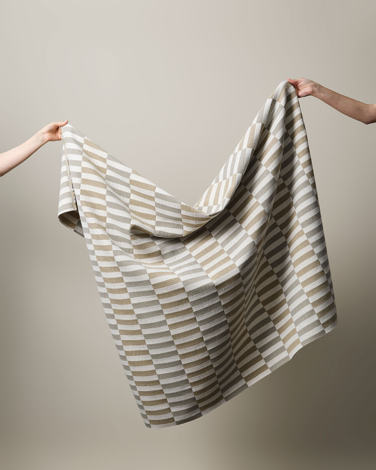 If Mending is about care, Join is about harmony. Slightly irregular stripes with visual vibration – a signature of Marquina’s work – appear almost musical, reminiscent of piano keys in motion. The pattern balances repetition with variation, architectural clarity with a sense of breath.