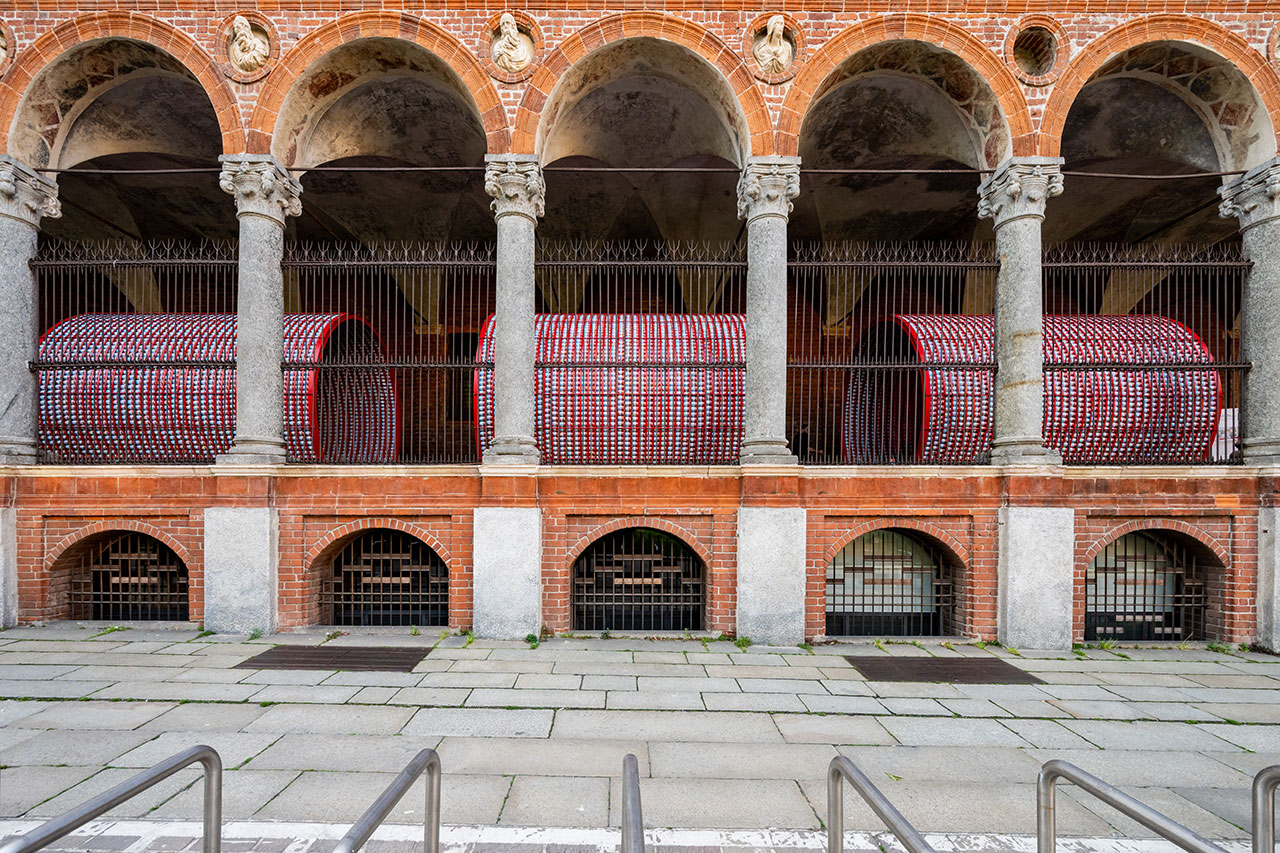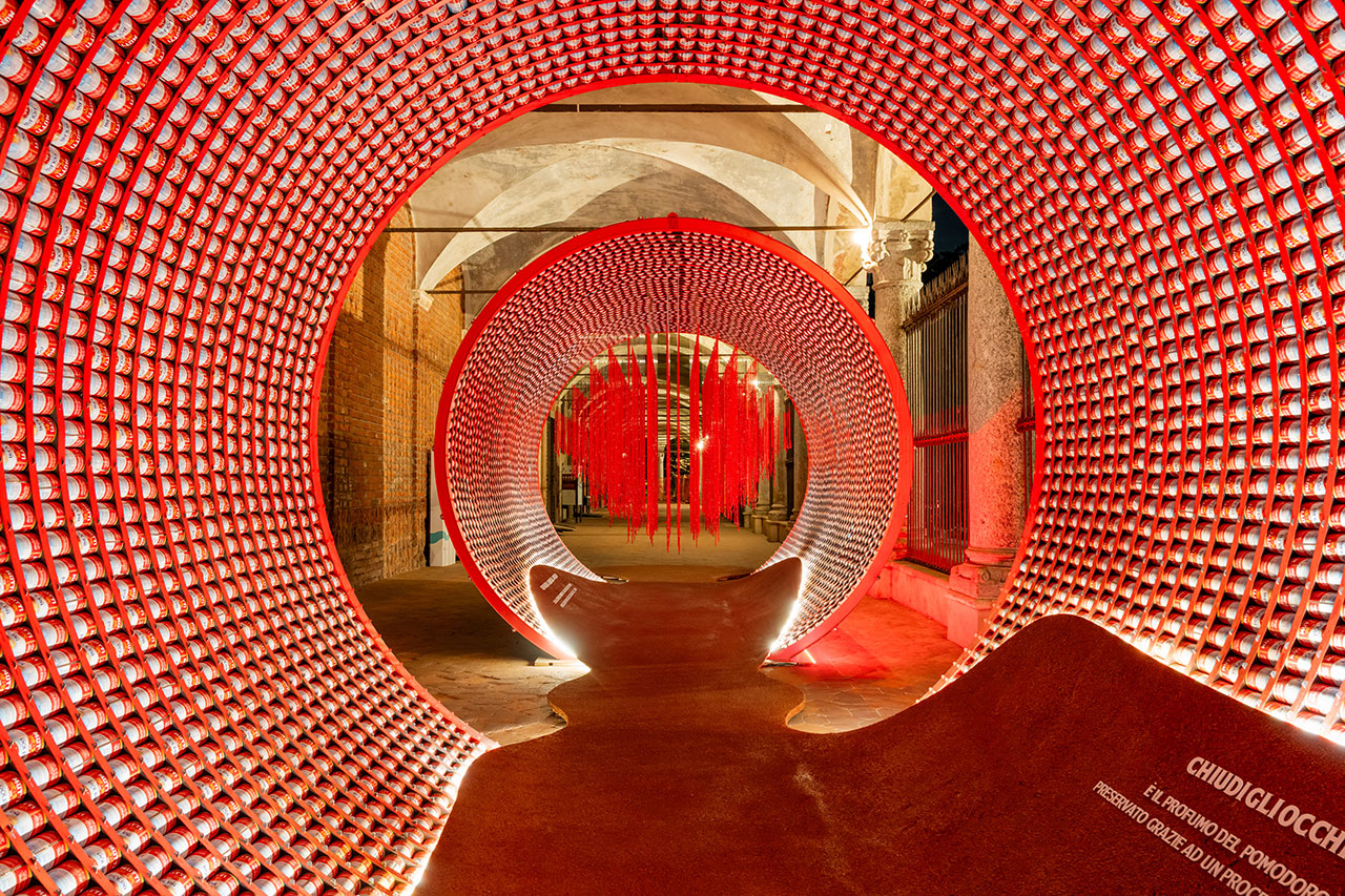 Here, that same basic can became the starting point for a different kind of exploration. Installed beneath the portico of the Università degli Studi di Milano, approximately twenty thousand cans of Mutti tomato pulp were supported by a steel substructure that allows them to be stacked and gradually removed without compromising their stability.