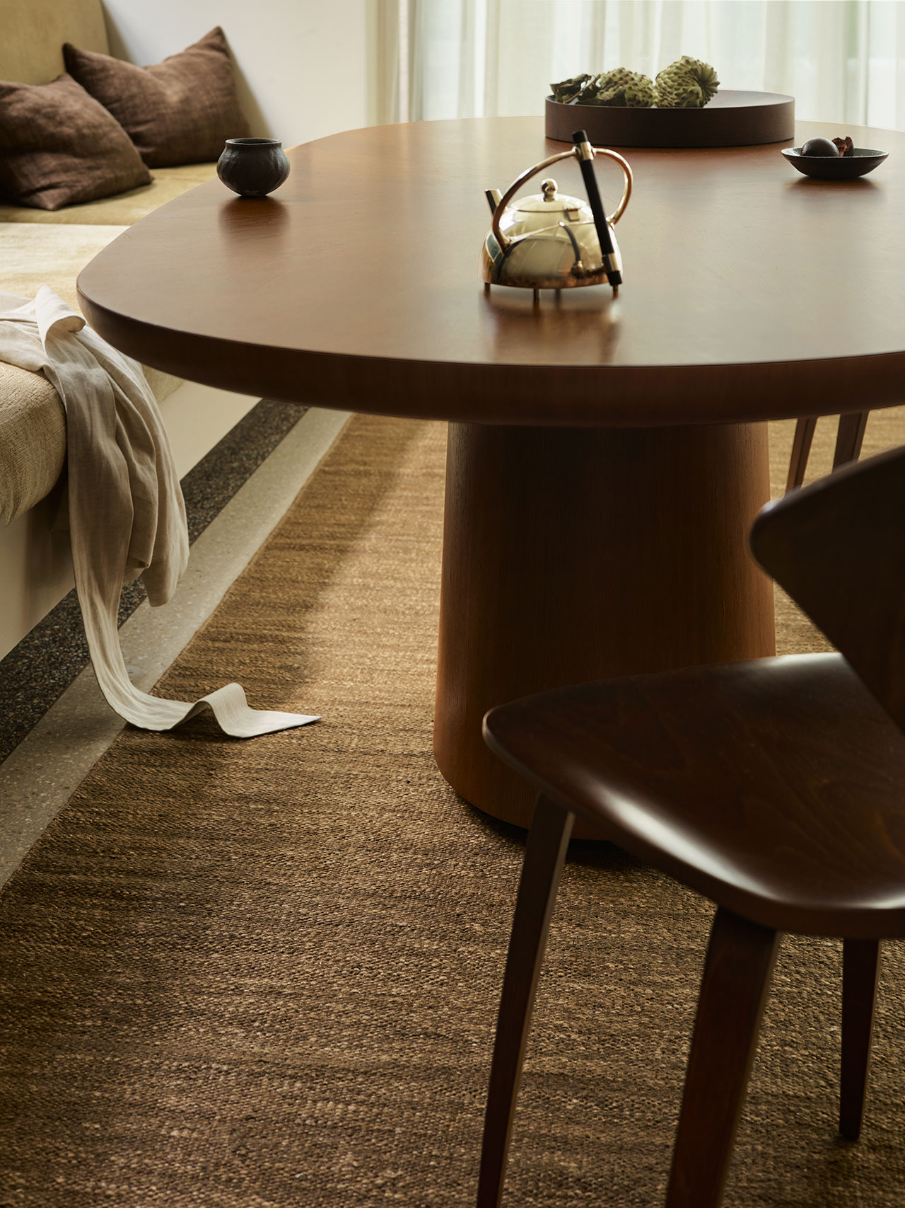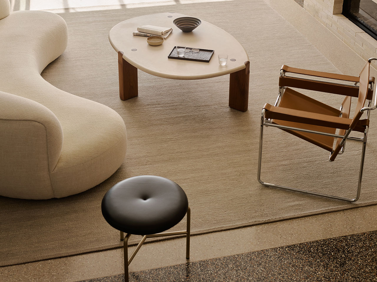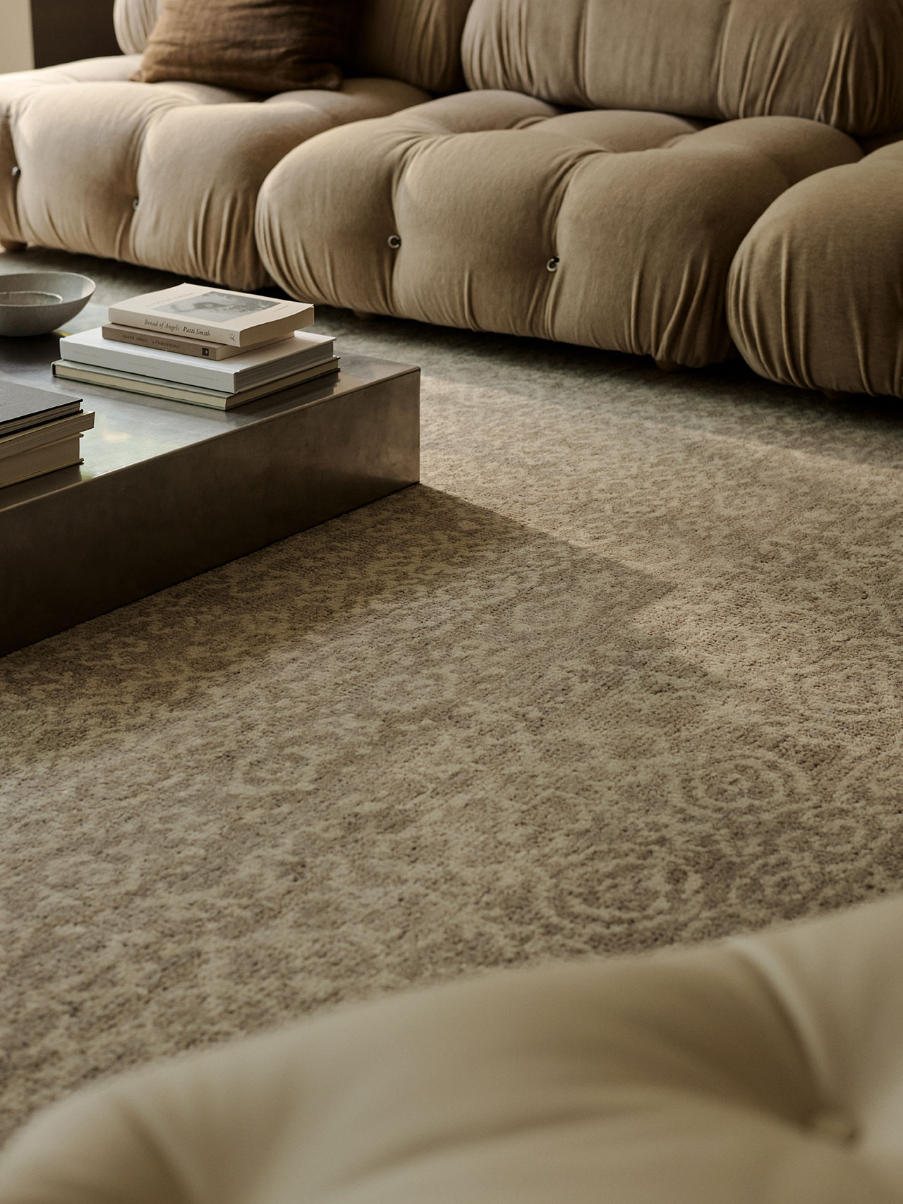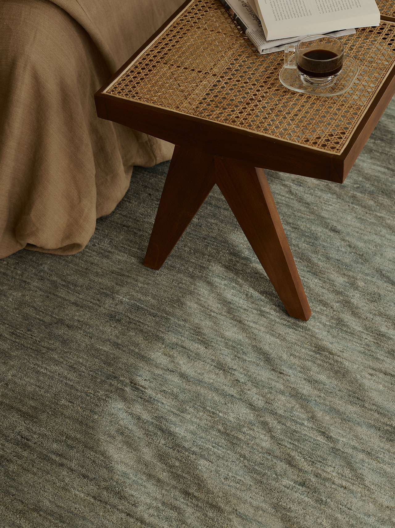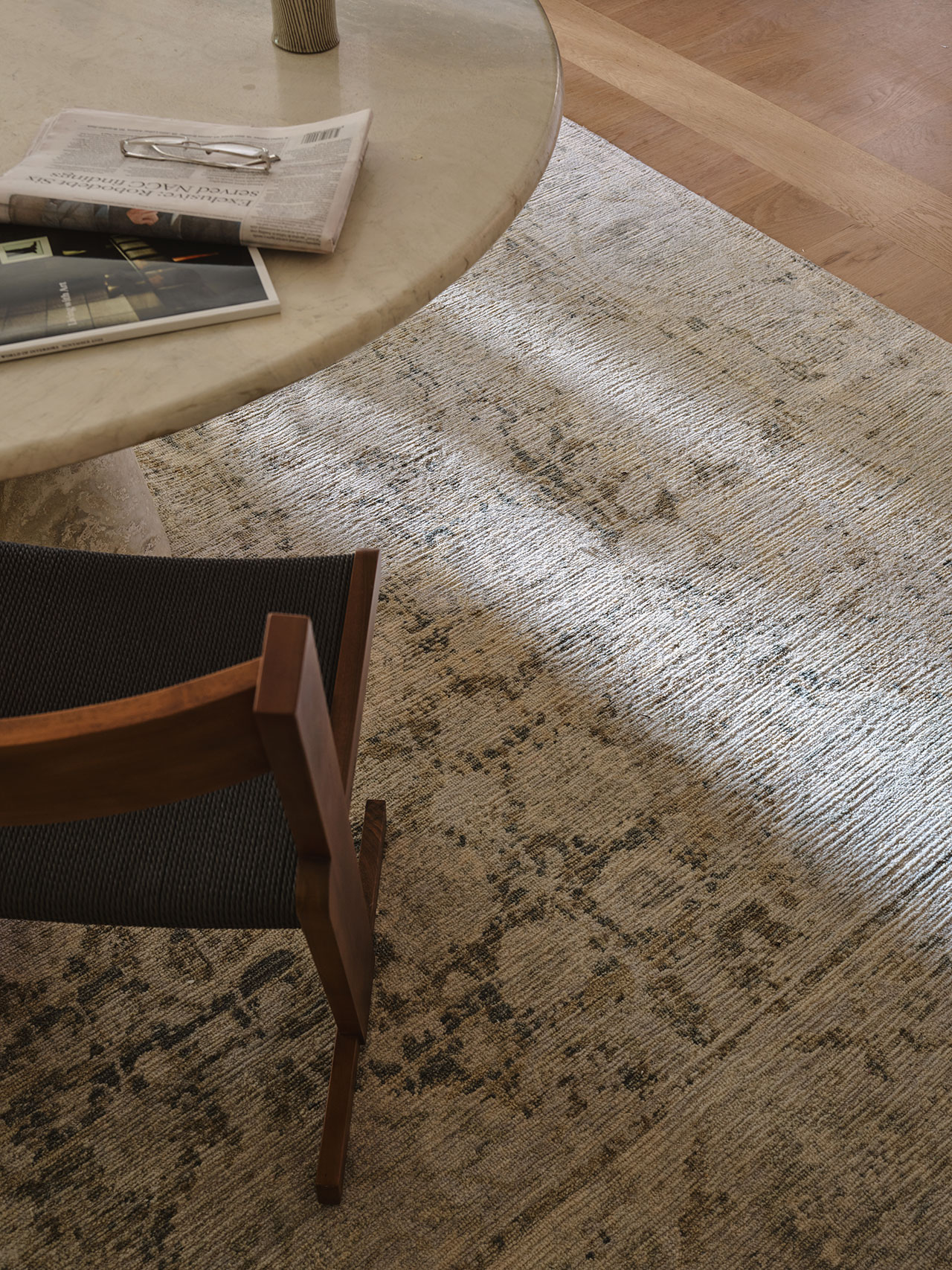 Odessa, seen here in Partridge, extends this language of quiet variation. A perennial design within Armadillo’s repertoire, its surface is defined by organic striations that ensure no two pieces are exactly alike. New tonal inflections—Partridge, Banksia, and Travertine—bring renewed clarity to the form.