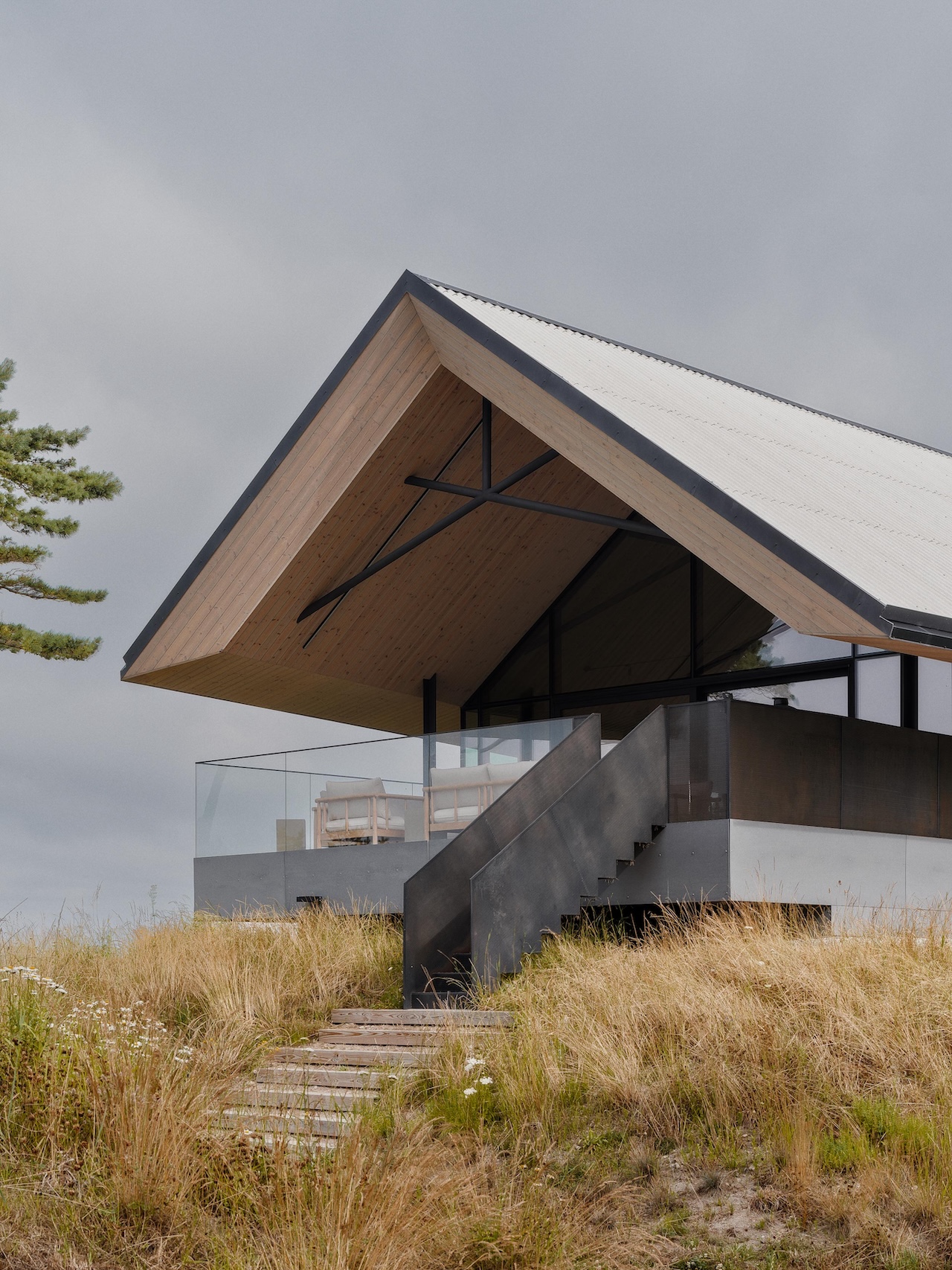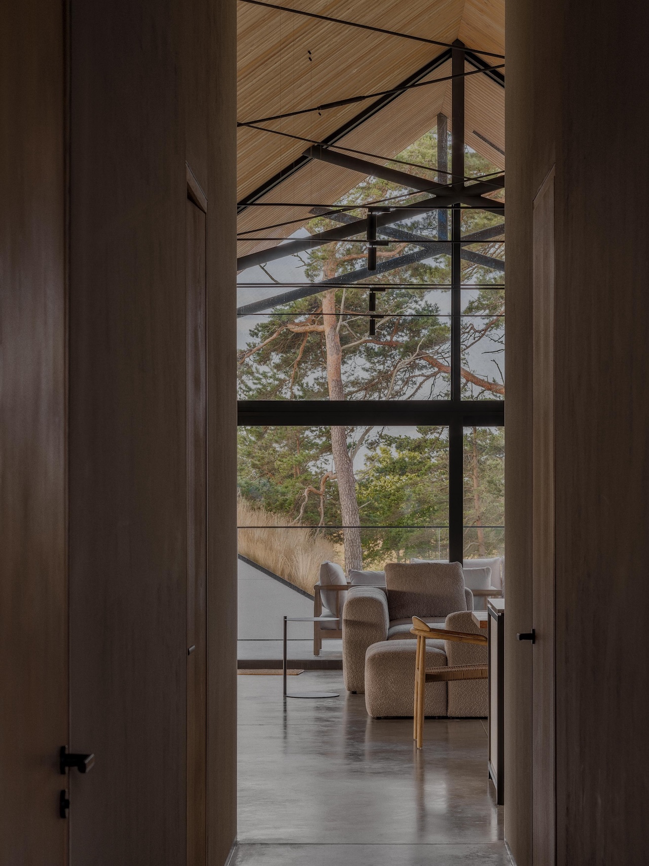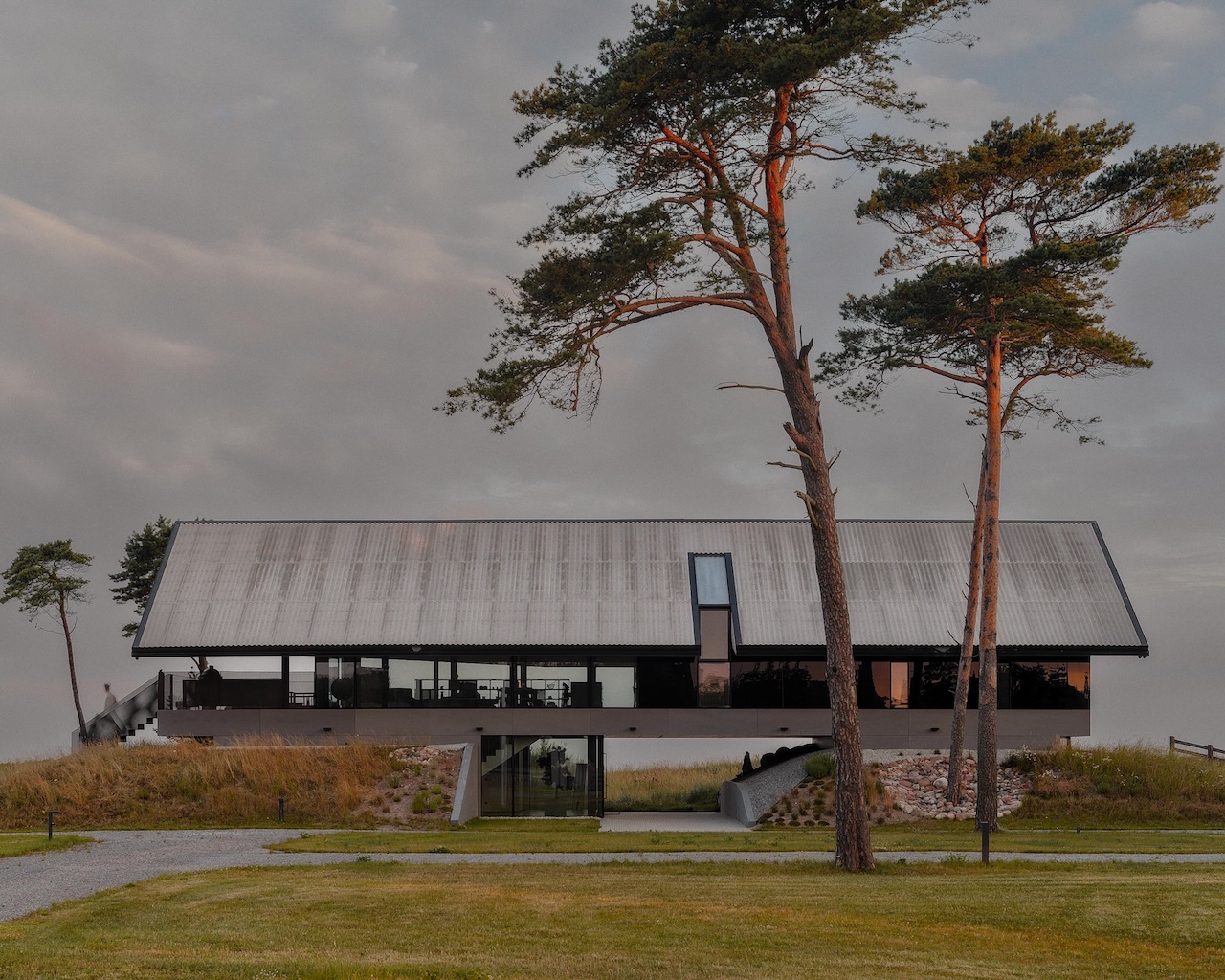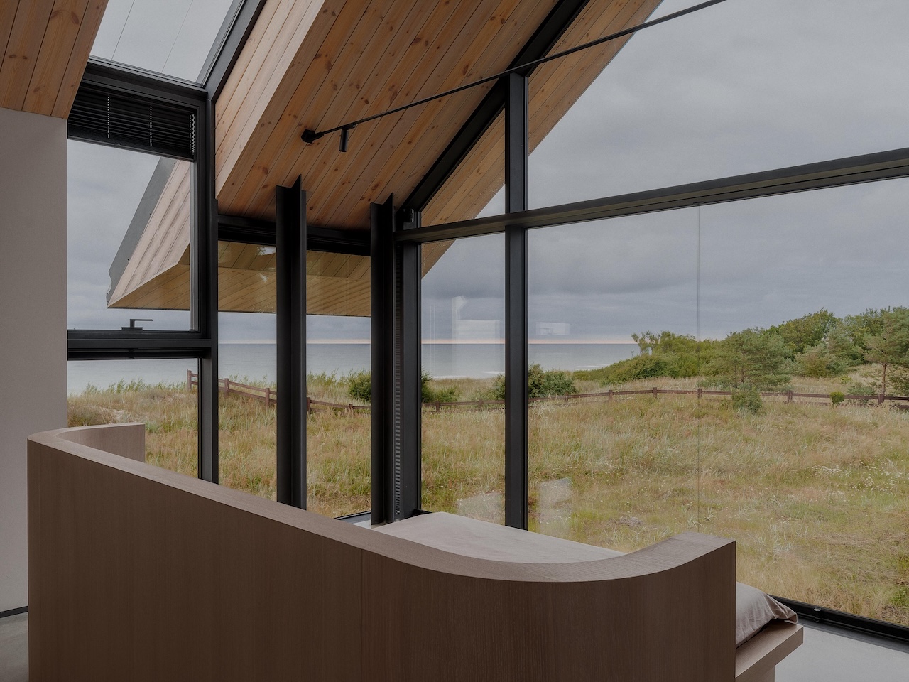 The overhang on the south face is carefully calibrated, with upward-sloping soffits that shield interiors from peak summer sun while drawing in the low-angle light that defines Baltic afternoons. The result is a roof that performs as both environmental mediator and psychological anchor – its weight counterbalancing the transparency below.