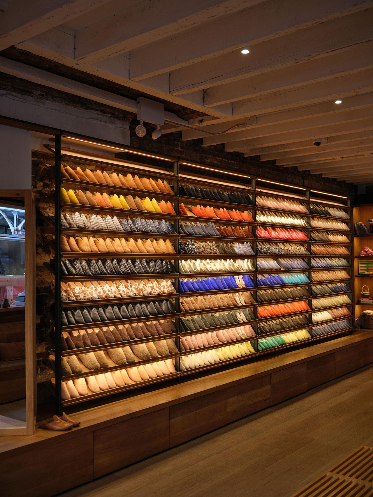 Inside, bespoke lighting by next-door neighbor Jill Platner casts each corner as a distinct vignette, inviting you to linger. This is intentional: as modern consumers, we’re accustomed to shoes that feel comfortable immediately—rarely pausing for those that require a break-in period, especially when made by hand. Outside of dedicated loafer enthusiasts, an all-leather shoe has become increasingly uncommon amid the rise of athleisure. Finding the right pair, then, becomes something of a Cinderella moment. When it fits, you know.