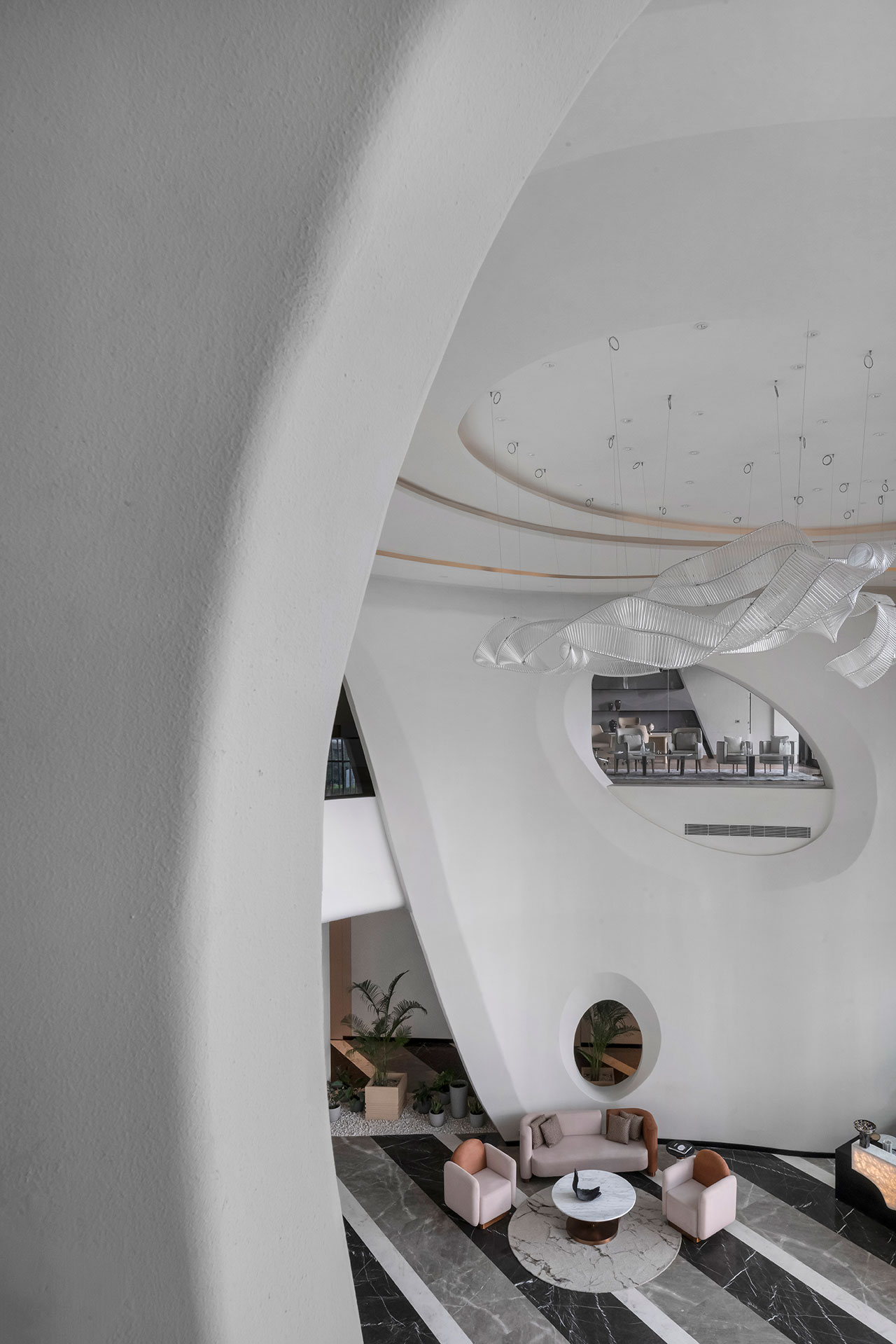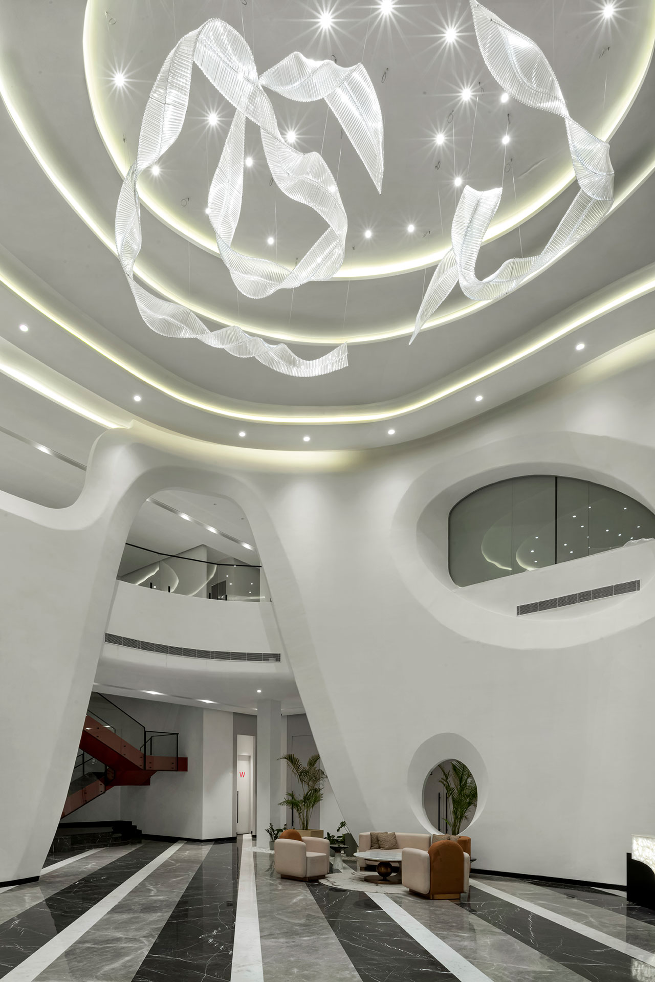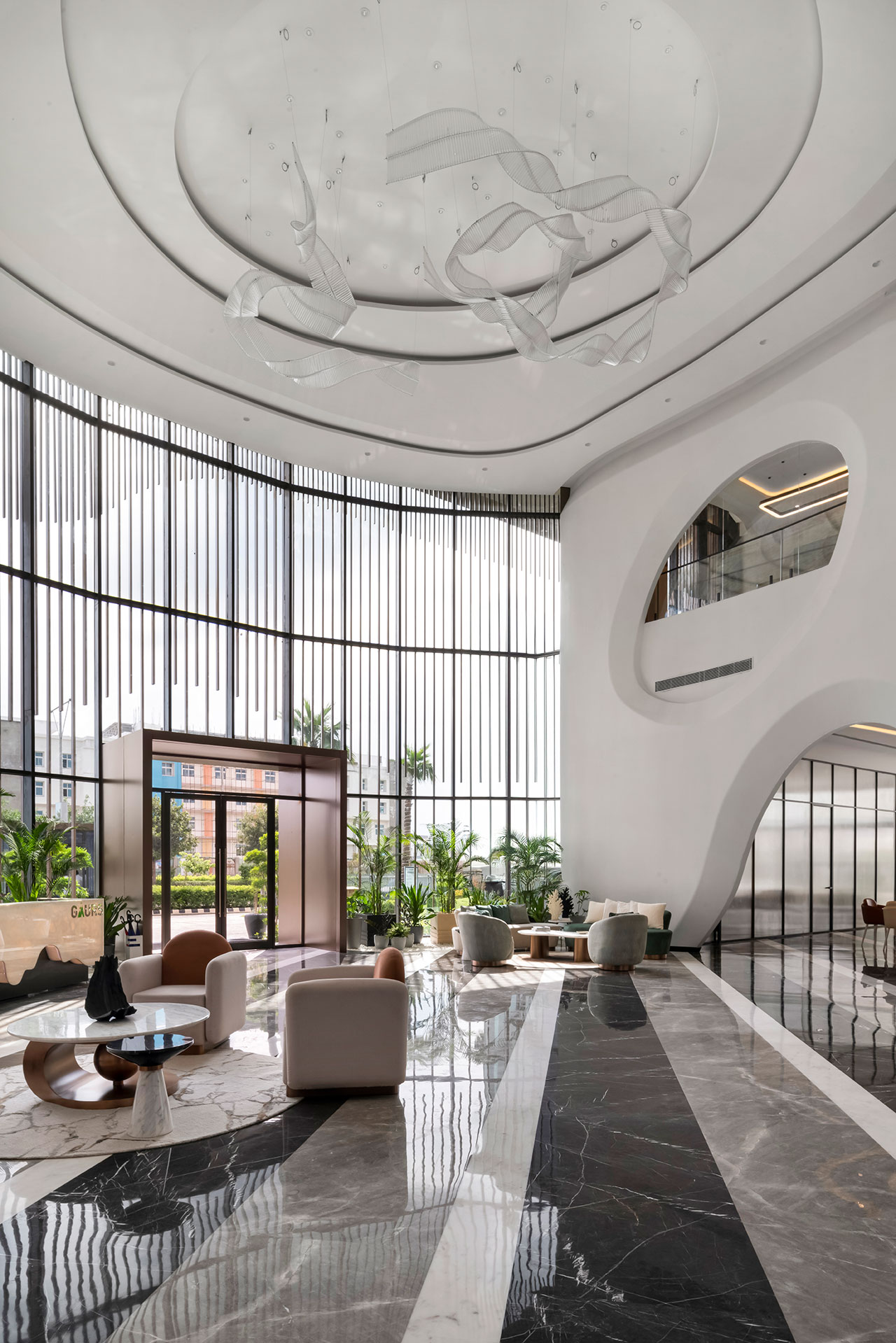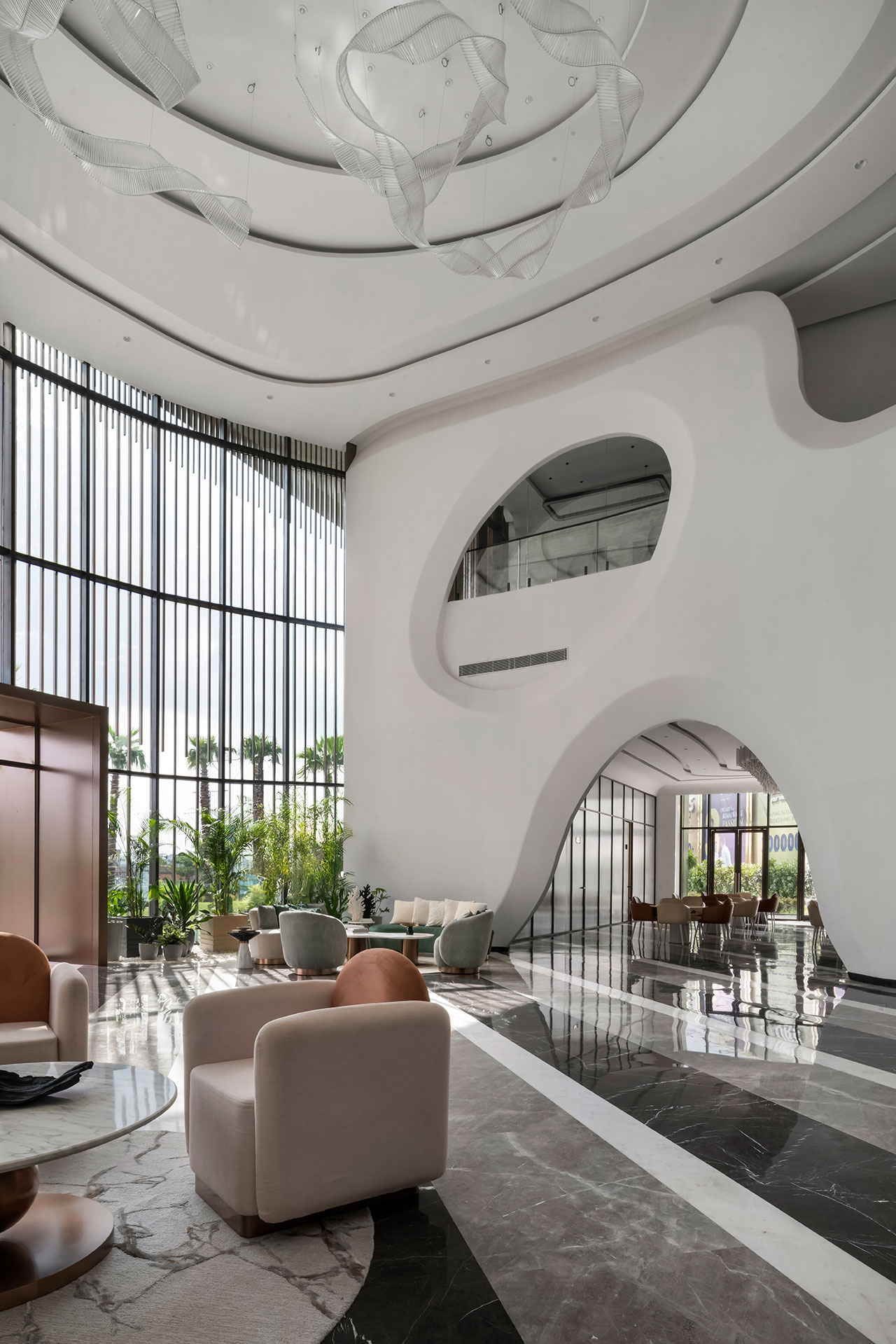 Moments of delight are found in every corner of the gallery. Portals and glass doors offer just enough separation yet maintain visual flow. Polished marble flooring that features light and dark diagonal slabs adds luxury underfoot. A diaphanous ribbon fixture seems to float overhead like a cloud.
