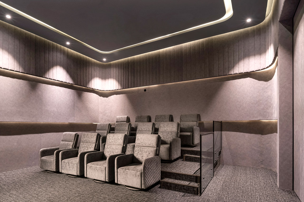 A series of lounges allow potential buyers to review options in plush settings reminiscent of hospitality environments where comfort is key. The café is a favorite spot, with touches that reinforce the developer’s emphasis on Manhattan-inspired living. Clients can sit in the theater-style audio-visual room and watch a presentation. Reserved for executives, workspaces on the upper level balance privacy and transparency.